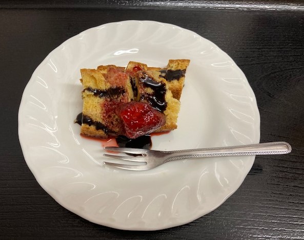 本日ご紹介するおやつは「フルーツケーキ」です。バターを使わないケーキに、ワインで煮た苺ソースとチョコソースをかけた物です。