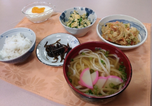 1月23日の昼食は大人気メニューの「かき揚げうどん」でした。かき揚げが食べやすく分かれていましたので、おうどんの中に入れて食べたり、そのままの食感を楽しんだりしていらっしゃいました。