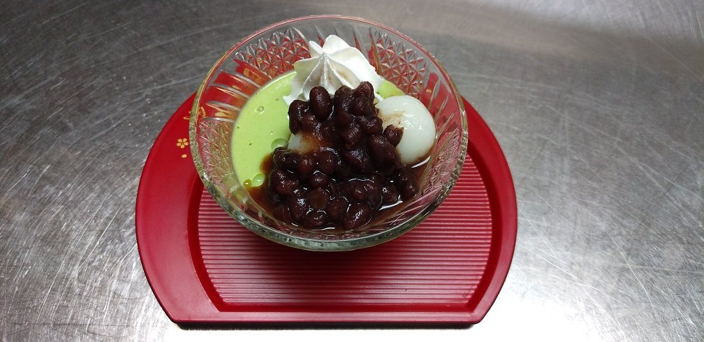 たくさんの小豆とホイップクリームに白玉のトッピングは、抹茶ババロアというよりも「小さなまっちゃパフェ」と呼べるスイーツに仕上がっておりました。