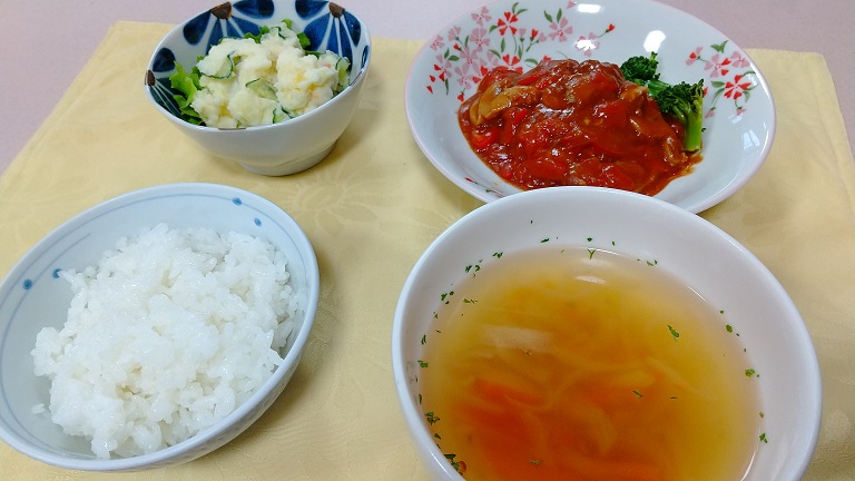 じっくりとトマトソースで煮込まれて柔らかくなったハンバーグ、適度に冷やされて今の季節だと食べやすく感じるポテトサラダ、スッと飲み干す事が出来るオニオンスープ。