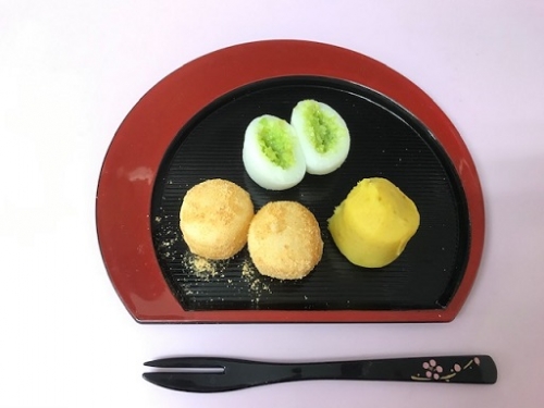 写真のおやつは写真左から「きなこ団子」「ずんだ団子」「さつま芋あん」です。