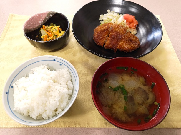 主菜の「とんかつ」は、サクサクとした衣とジューシーなお肉が食欲をそそる一品です。付け合わせのキャベツの千切りやトマトが彩りを添え、目でも楽しんでいただけ舌でも楽しんで頂けたかと存じます。