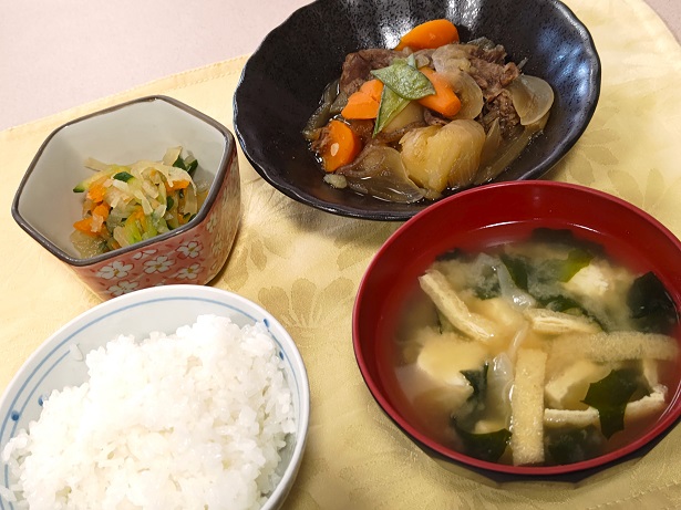 主菜は、家庭的な味わいの肉じゃがです。じっくりと煮込まれたお肉と野菜に味がしっかりしみ込んでおり、温かさが体にじんわりと染み渡る一品でした。当施設のお食事は、専任のスタッフが出汁をとるところから丁寧に調理しているため、オリジナルのお料理を多くご提供しています 。