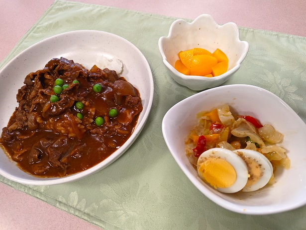 本日は、施設の食堂いっぱいにデミグラスソースの香りが広がる、洋食の定番ハヤシライスが献立に登場いたしました。