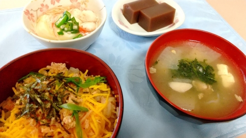 私がこれまで施設の中で食べさせて頂いた汁物の中で一番美味しいと思いました「かみなり汁」が昼食に並びました。しかもデザートの水羊羹まで付いてきた御馳走の日でした。