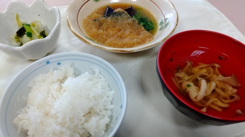 魚のみぞれ煮の大根おろしがとても美味でした。そして今日の汁物はきのこ汁。のど越しが良く、おかわりが欲しいお味でした。