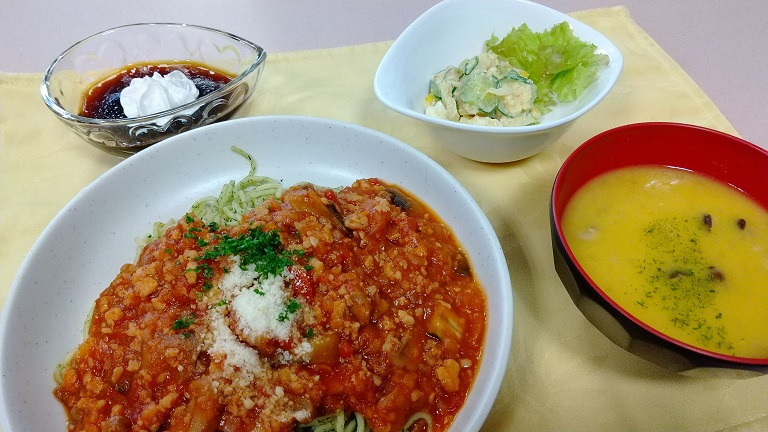 スパゲティミートソース、コーンチャウダー、サラダ、コーヒーゼリーという献立で、待望の洋食メニューが昼食に登場致しました!