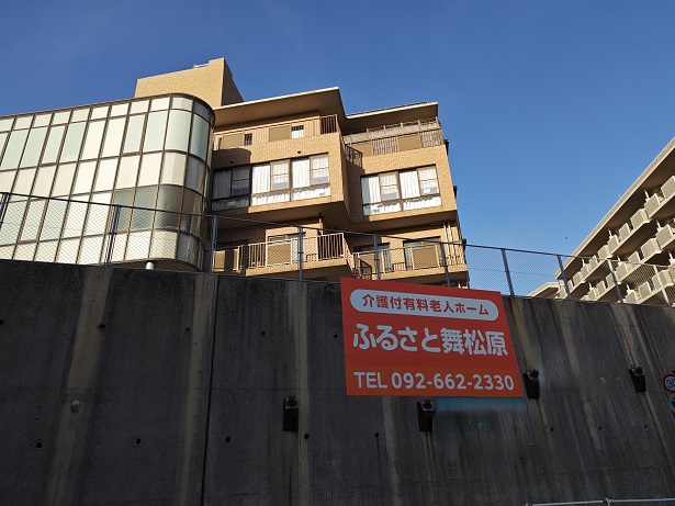 福岡県指定介護付 有料老人ホームふるさと舞松原は、福岡県福岡市東区舞松原のJR舞松原駅から徒歩1分に御座います。駅を背にしてロータリーから左手を見上げて頂ければ、こちらの看板が見えます。
