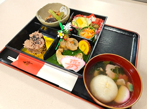 福岡市東区の「介護付有料老人ホーム ふるさと舞松原」でも、元旦の昼食にお正月のお祝い膳をご用意いたしました。厨房スタッフが総出で腕を振るった、心づくしの「おせち料理」をご紹介いたします。