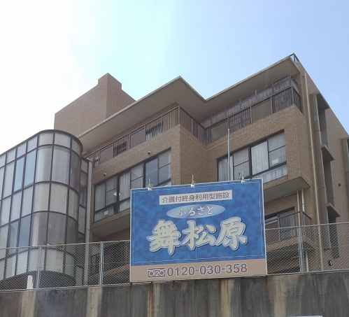 福岡県指定特定施設 介護付き有料老人ホームふるさと舞松原はJR舞松原駅から徒歩1分に御座いまして、JR舞松原のロータリーより駅を背にして見上げていただければ左手に御合います。