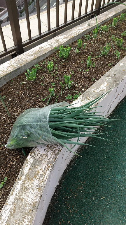 行事の一つとしてご一緒に楽しみながら収穫を行いました。今回はこちらのネギ、植えてから初めての収穫になりますのでワケギぐらいの程よい太さで収穫が出来ました。