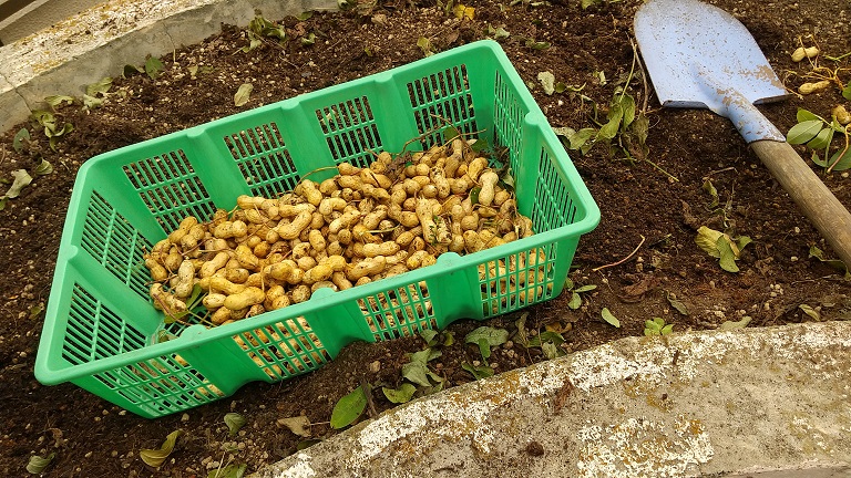一株でこれだけ採れました。入居者様全員に行き渡るだけしっかり実が採れました。茹でピーナッツを入居者様の食卓にお届けする予定です。もしかしたら茹でピーナッツ以外にも何かお料理になるのだろうかと話に花が咲きました。
