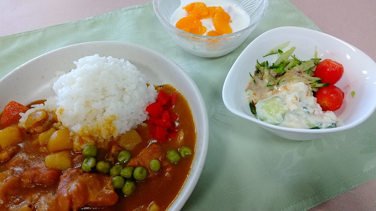 定期的に食べたくなる「カレーライス」の日が来ました。彩りの福神漬けとグリンピースが映えるカレーでした。香辛料やお肉も健康を維持していく為には良い要素ですので、定期的なカレーの日は大切だと思います。