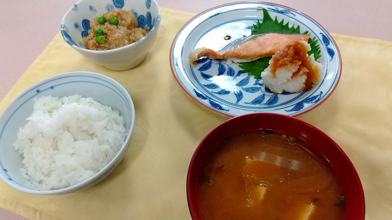 昼食に、焼き鮭や赤味噌のおみそしるなどが並びました。寒さが本格的になった今、とても有難い昼食になりました。シャケは残食の少ない魚の一つです。