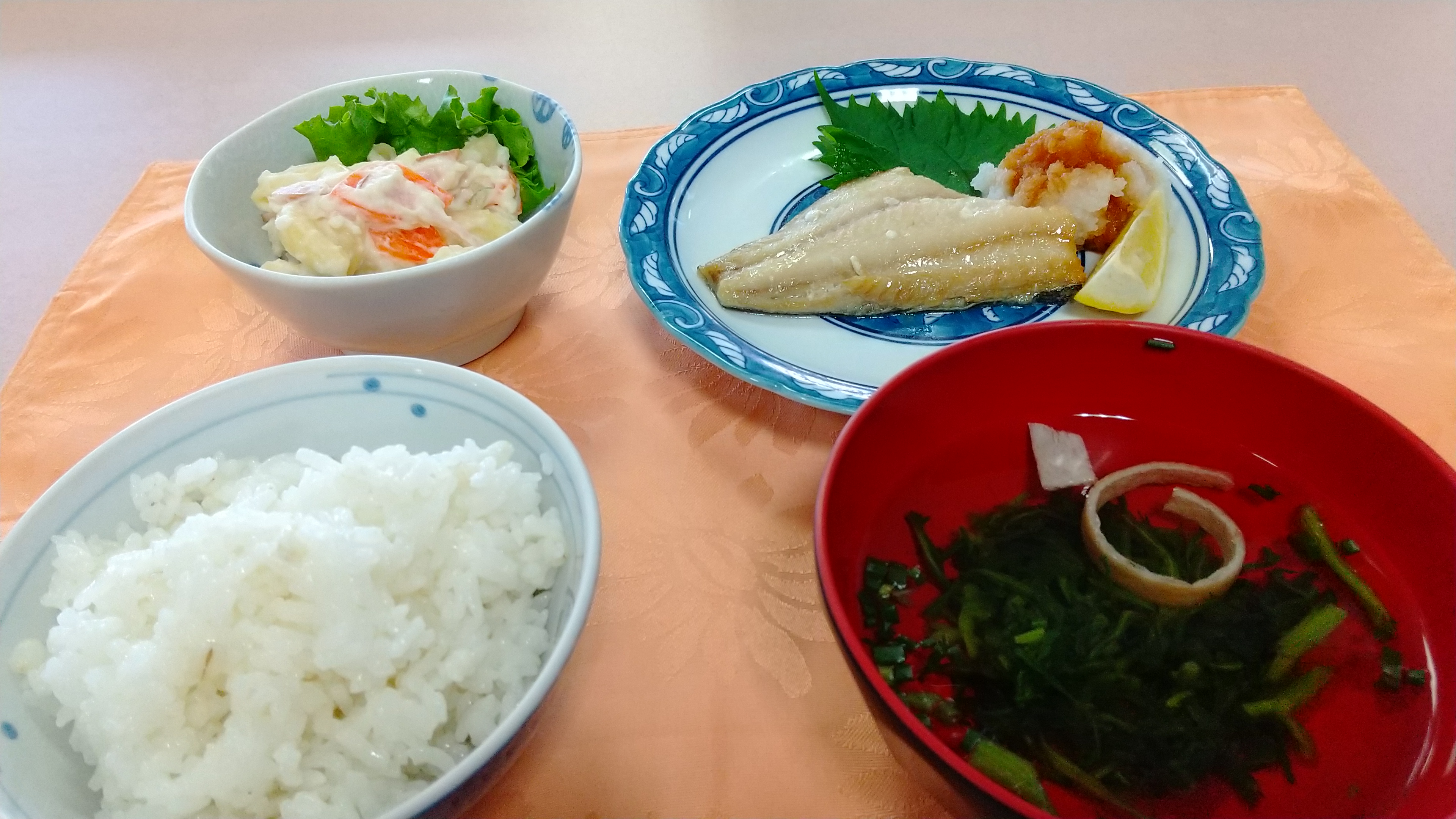 ホッケの塩焼きを中心とした、和風の昼食が食堂に並びました。