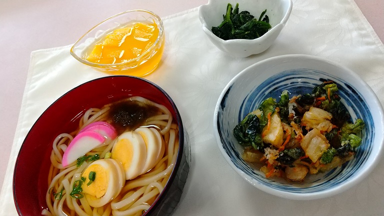 丁寧なおだしと色々な具でとても美味しく頂けるおうどんになっております。かき揚げは、入居者様が飽きる事が無いように具材に変化をつけてお出ししております。