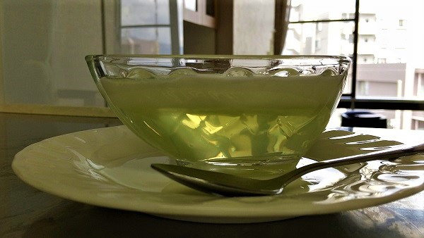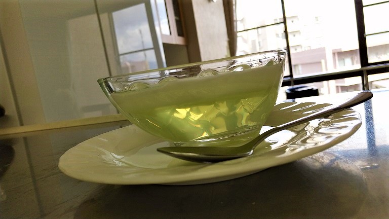 見た目で涼しさを感じる青りんご味のゼリーが本日のおやつでした。のど越しも良くてゼリーの上にかかったミルクソースとの相性も抜群でした。
