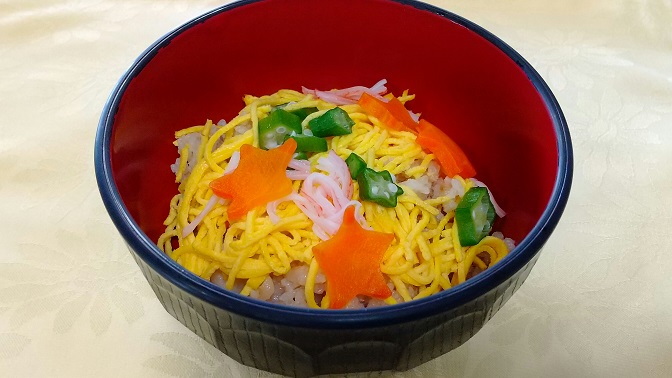 ニンジンやおくらで星を意匠し、錦糸卵とカニカマで天の川を意匠したちらし寿司です。