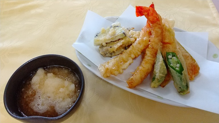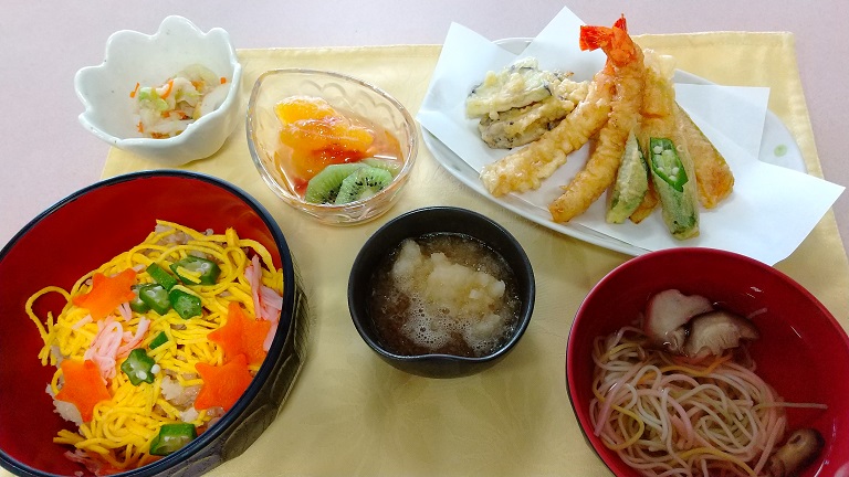 続きましては、ふるさと舞松原の厨房が得意としております。天ぷらのご紹介です。天ぷらの中身は、海老・南瓜・オクラ・茄子・しめじでした。優しい味に調えられた天つゆで頂きました。入居者様の一番人気は「海老」でした。