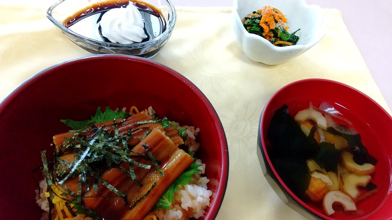 しっかりと味付けされた穴子の蒲焼の匂いが食堂に流れている中、オリンピックの中継をBGMに皆さん黙々と召し上がっておりました。オリンピックの結果が気になるからなのか、本日のメニュー所以なのか静かに静かに召し上がって、蒲焼丼の残食がほぼ無しという、作り手である厨房スタッフが喜ぶ結果となりました。