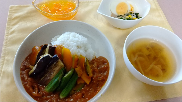 カレーが食卓に並ぶ日がまいりました。ふるさと舞松原では、夏の時期は献立で「カレー」ではなく「夏野菜カレー」となります。