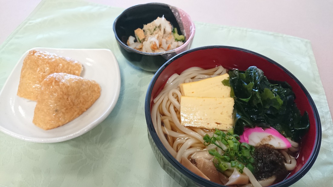 おうどんと稲荷寿司がお昼ご飯として食卓に並びました。お店に来たり、サービスエリアに寄って頂いているようなメニューの登場に、多くの入居者様が本日も喜ばれておりました。