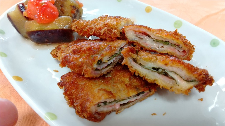 施設の屋上菜園で採れた大葉とチーズが良いアクセントになっておりました。ソースをかけなくてもしっかりとした味を感じる事が出来る素敵なメニューでした。個人的にはお塩で食べるのも良さそうだと思いました。