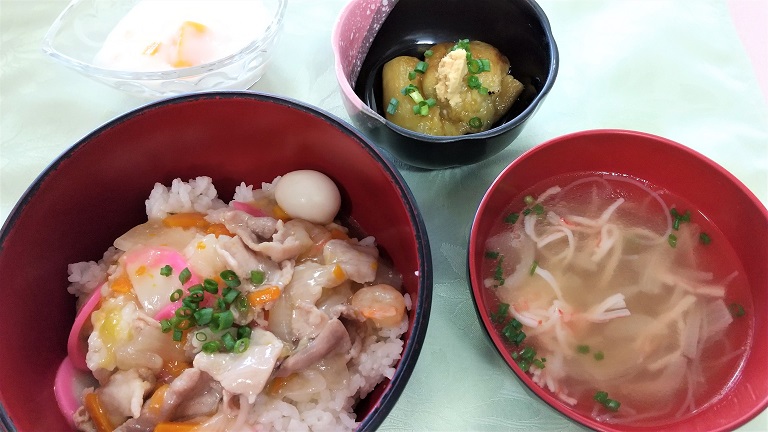 うずらの卵がしっかり入った中華丼に、コクを感じる中華スープ、お口直しや箸休め役に感じた焼き茄子、デザートのフルーチェです。