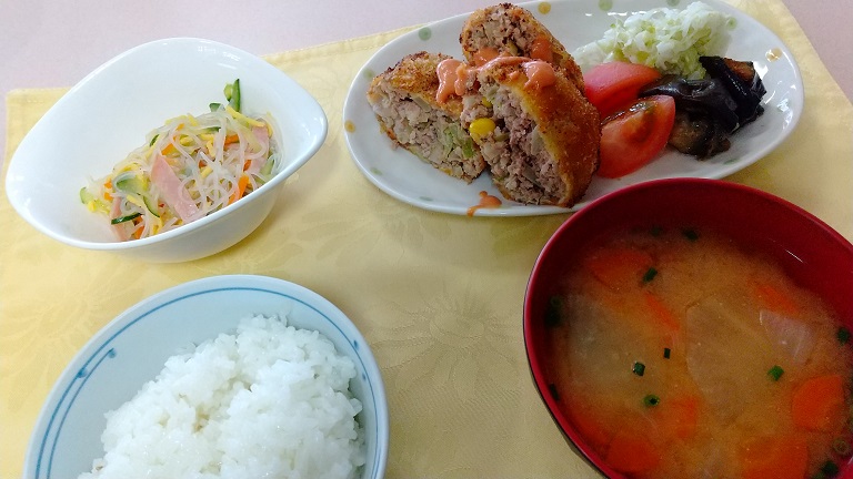 食べ応えがあり、タネは肉汁などでしっとりとした美味しさが御座いました。付け合わせやお味噌汁の具などで野菜もたっぷり取れるお食事でした。最近、お魚がメインの献立のご紹介が少ないですが、朝食や夕食に頻回に並んでおります事を添えさせていただきます。
