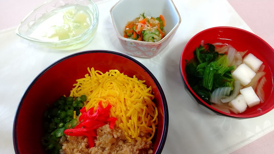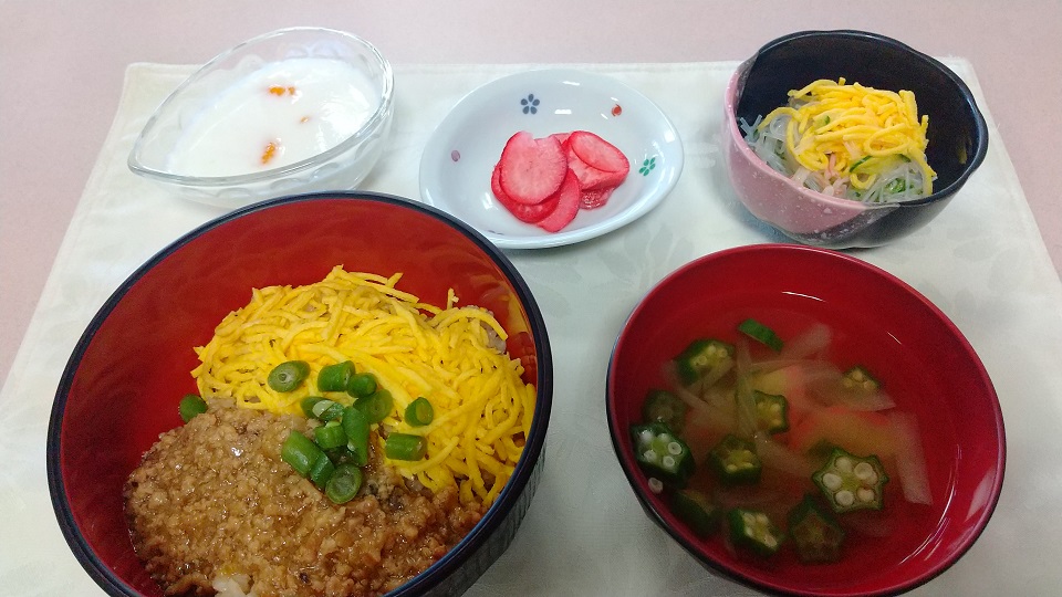 優しい味付けの餡とそぼろの相性が人気のヒケツの様子です。また、そぼろ以外の具材として「錦糸玉子」「紅ショウガ」「インゲンなど青菜類」など見た目で華やかな具材が盛り付けられ、三色丼に早変わりです。この「そぼろ丼」は職員にも人気で、大盛りを希望する職員が居る程です。