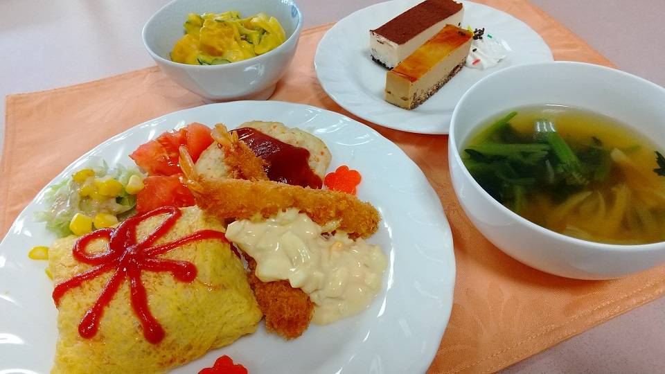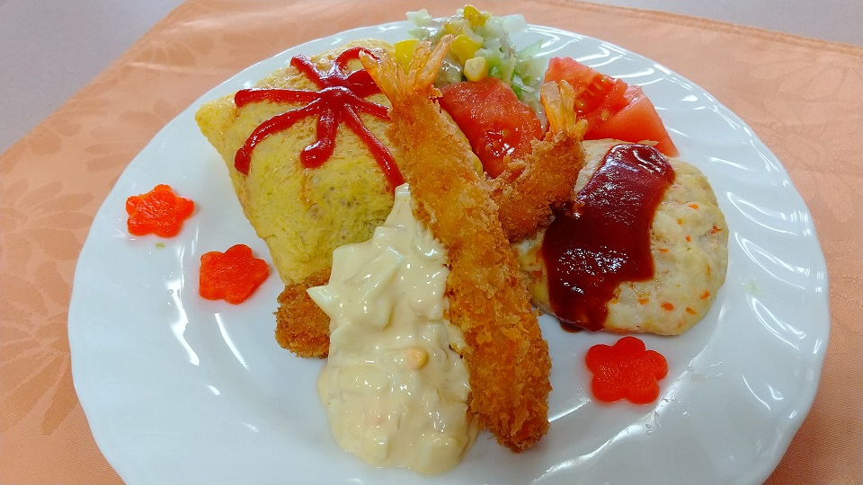 ボリュームがたっぷりでケチャップの飾りが可愛らしい「オムライス」。衣がメインではなく食べ応えのある身が詰まった見事な「エビフライ」。子供も大人も大好きな「ミニハンバーグ」。そして栄養バランスを考えた「サラダ」です。