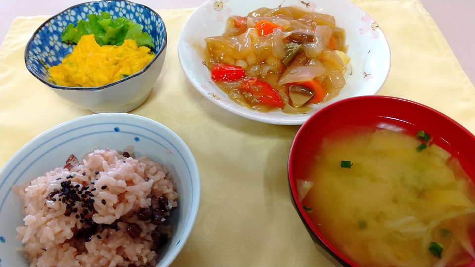 当施設では栄養面や食べやすさなどの観点から「酢豚」ではなく「酢鶏」が登場いたします。トロミのついた酢鶏は食べやすく野菜も多く食べる事が出来て人気のメニューの一つです。