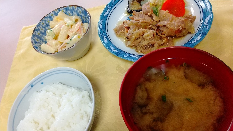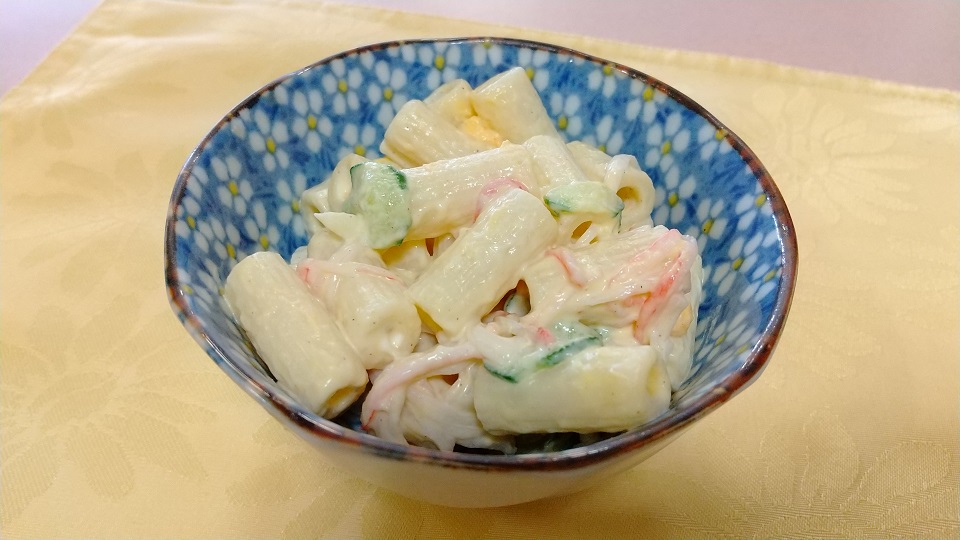 ペンネが大き目の「マカロニサラダ」です。お箸でも取りやすくて食べやすいサラダとなっており、入居者様に人気の小鉢となっております。