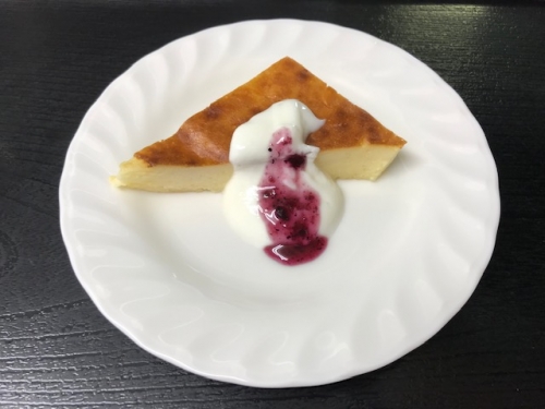 手作りチーズケーキです。ソースと合わせて食べても、そのまま食べても良しのチーズケーキです。当施設の管理栄養士と調理スタッフはデザート作りにも力を入れていて、毎日美味しいおやつを提供させて頂いております。