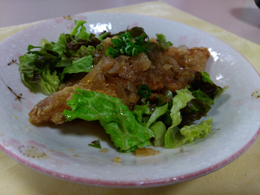 施設で下ごしらえをしっかり行ってから揚げる魚の唐揚げは、中までしっかり火が通っているにも関わらず固すぎない歯ごたえで食が進みました。唐揚げに程よく染み込んだソースとの相性もピッタリでした。