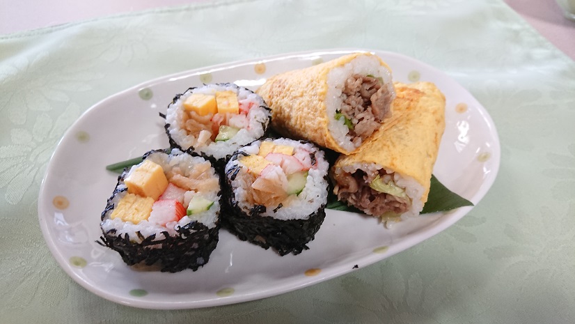 二品目は新作寿司の「プルコギ風の玉子で巻かれた巻き寿司」でした。この新作巻きずしはプルコギ風の甘辛な味付けに玉子の味が加わってマイルドでとても美味しいお寿司だったと入居者様から感想を頂きました。