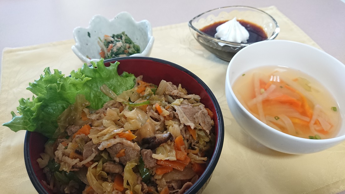 具材一つひとつの食べやすさを考えた調理は調理スタッフの工夫の賜物です。”スタミナ”丼では御座いますがマイルドな味付けとなっておりましたので、入居者様の多くが完食されたとの事でした。