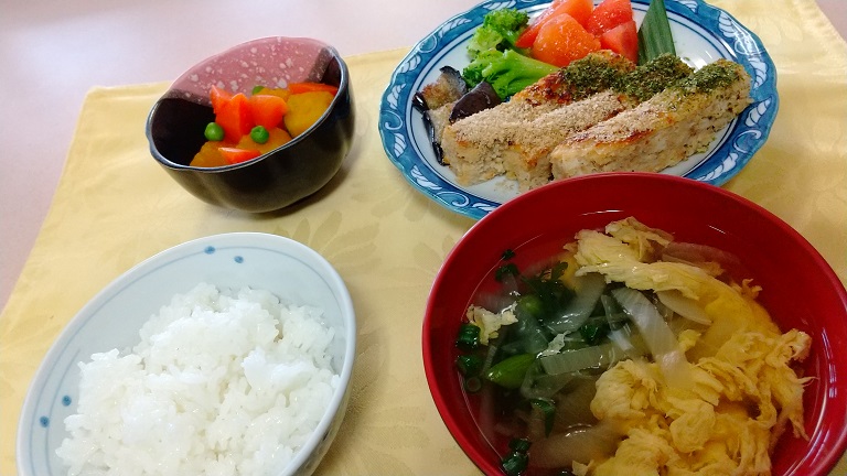 二色に飾られた松風焼きがとても香ばしく美味しいとのお声を入居者様から頂戴いたしました。添えられた野菜、小鉢、かきたま汁と全体を見渡せば「彩り」も「栄養」もバランスの取れた食事となっておりました。