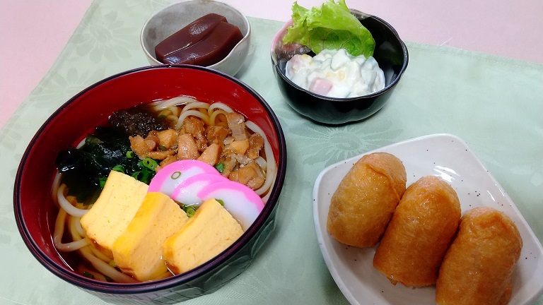 玉子焼き、ワカメ、かしわの甘辛煮風、かまぼこ、とろろ昆布としっかり五目になった「五目うどん」に「稲荷寿司」。サラダとして「アセドアンサラダ」。デザートとして「水羊羹」。