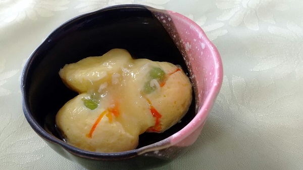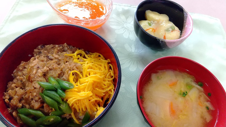 丁度良い風味の餡がかかった蟹玉がのど越しも良く美味しく頂く事ができました。優しいお味は、主食のご飯物「三色丼」の口直しにもなって相性がバッチリでした。見た目で楽しめる小鉢は目立つのも伴ってか、入居者様完食されている方が多数で御座いました。