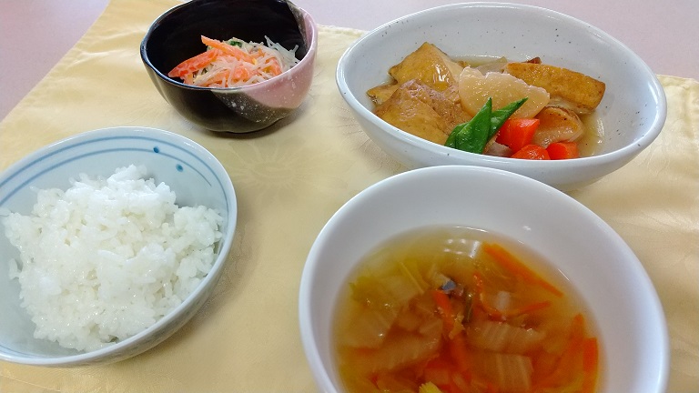 本日の献立のメインは『大根と鶏肉の煮物』です。他のメニューといたしましては「白飯」「春雨サラダ」「野菜スープ」となっており、和風に寄ったバランスの取れた食事で御座いました。