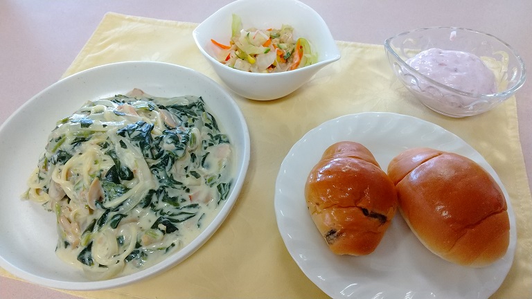 入居者様よりレーズンバターロールとクリームスパゲッティの食べ合わせが絶妙に美味しいとアドバイスを頂いて試した所、おっしゃる通りで御座いました。