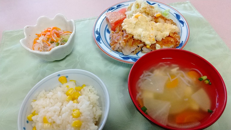 メインの「チキン南蛮」は、いつもの施設謹製タルタルソースにトウモロコシが加わって食感がアップした素晴らしいソースになっておりました。サクサク衣のチキンにかかったソースと食べると自然と笑みが零れてしまいました。