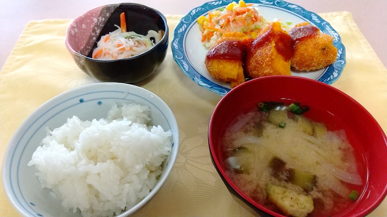 本日の昼食は御入居をお考えの皆様にも是非お勧めしたいメニュー「南瓜コロッケ」の登場です。