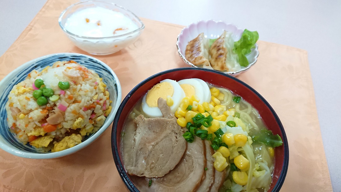 配膳させて頂く際のお声掛けとご返事が賑やかになる昼食でした。チャーシュー麵のチャーシューと麺に関しましては、入居者様それぞれの状態に合わせた工夫をしております。(写真は職員用になります)