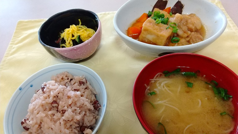 揚げ出し豆腐もついており、ボリュームは満点。お赤飯とお味噌汁、ミョウガとワカメの酢の物が他の献立で御座います。