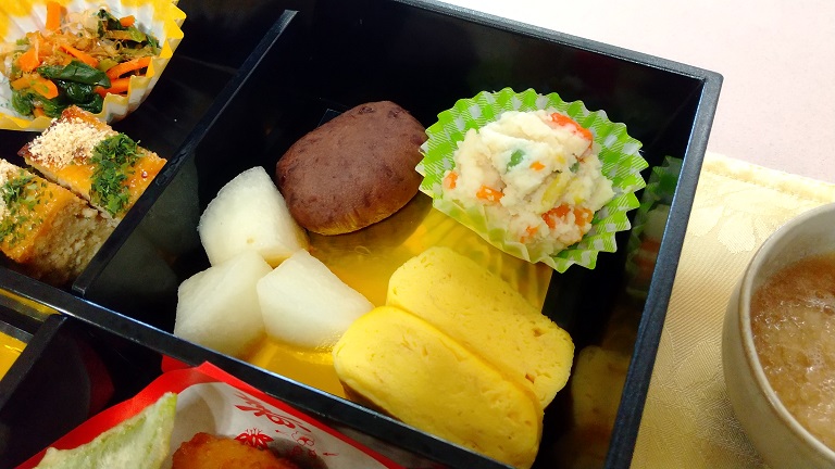 卯の花サラダに出汁巻、デザートとして梨とおはぎです。卯の花のサラダはあっさりしていて食べやすく好評でした。こちらは日常の食卓にも登場してもおかしくないメニューですので期待したい所です。おはぎと梨も季節感を感じて美味しさが増していたと存じます。