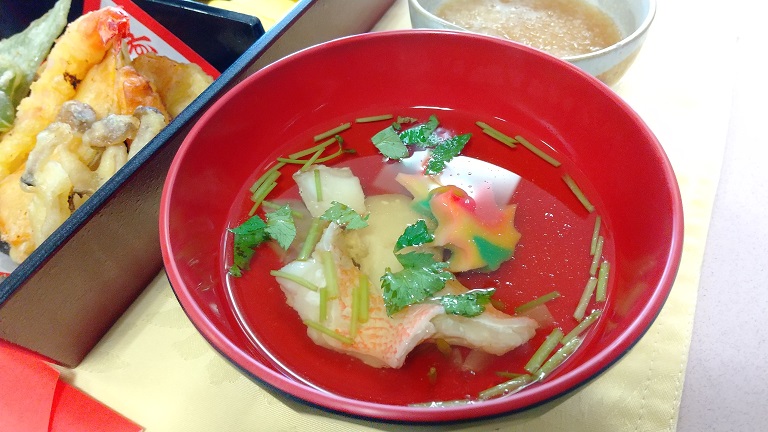 赤魚の酢の物です。鯛は骨の問題がありますので安全面を考えての対応となっております。だしは施設の厨房でしっかり昆布や煮干しから取りますので芳醇な香りのするお吸い物になっておりました。入居者様の中にはお味噌汁よりも当施設のお吸い物を好まれる方もいらっしゃいます。