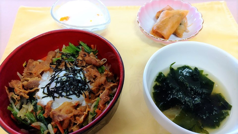 ビビンバは混ぜても良し、ほんの少し温泉卵を崩しながら味の変化を楽しんでも良しと良い事づくめで御座いました。お肉好きな入居者様にお声掛けいたしました所、とてもニコニコされておりました。