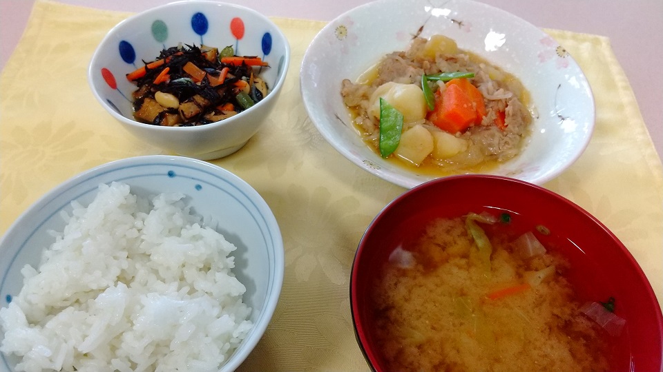 素朴なメニューかとは存じますが、野菜の切り出しやダシを取る所から丁寧に調理を行った和食になります。日々の調理を担う専任の管理栄養士や厨房スタッフだけではなく、配膳下膳・お食事の介助と、利用者様・入居者様を食堂にお迎えする時に配置されております職員一同、心を込めて努めさせていただいております。